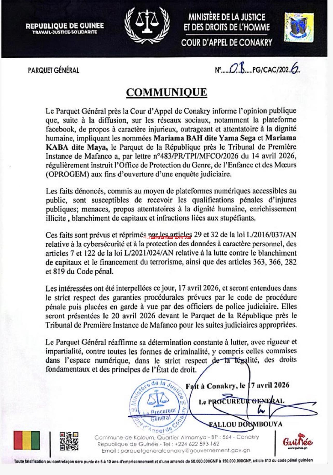 #ActuSociétéGN – « Le Parquet Général près la Cour d’Appel de Conakry informe l’opinion publique que, suite à la diffusion, sur les réseaux sociaux, notamment la plateforme Facebook, de propos à caractère injurieux, outrageant et attentatoires à la dignité humaine, impliquant les nommées Mariama Bah dite Yama Sega et Mariama Kaba dite Maya le Parquet de la République près le Tribunal de Première Instance de Mafanco a, par lettre n°483/PR/TPI/MFCO/2026 du 14 avril 2026… » C’est ainsi que le Parquet de la République a vendu la mèche de l’ouverture d’une enquête … »