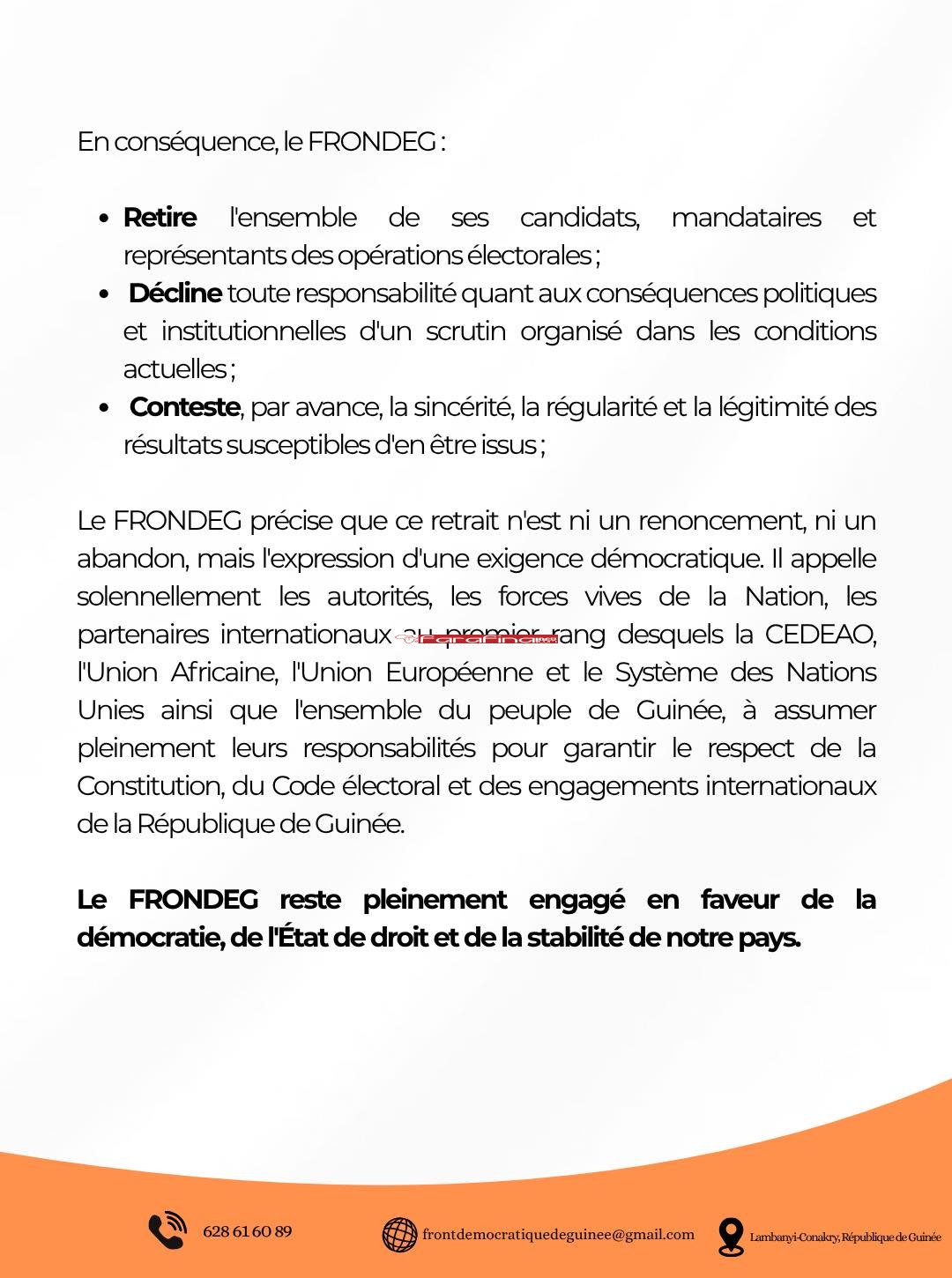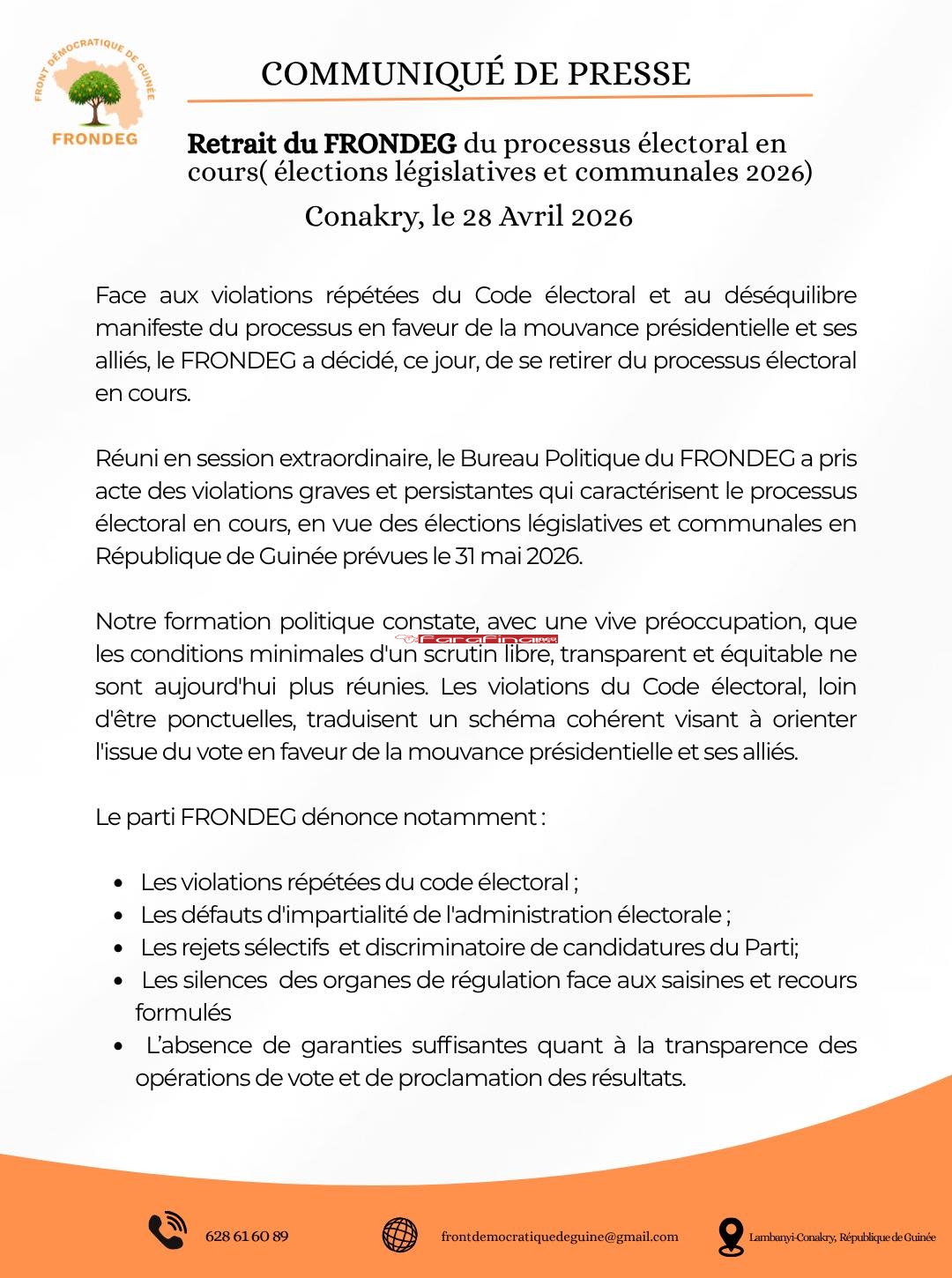 #ActuPolitiqueGN – « Ce choix fait suite aux nombreuses irrégularités constatées : violations du Code électoral, rejet de candidatures, manque d’impartialité et absence de garanties de transparence. Dans ces conditions, le 𝐅𝐑𝐎𝐍𝐃𝐄𝐆 estime qu’un scrutin crédible n’est pas possible et retire l’ensemble de ses candidats. Ce retrait est un acte de responsabilité, et non un renoncement. Le parti reste engagé pour des élections justes, transparentes et respectueuses de la loi.» C’est ainsi que le FRONDEG (Front Démocratique de Guinée) a annoncé son retrait du double scrutin [législatives & communales] du 31 mai 2026.